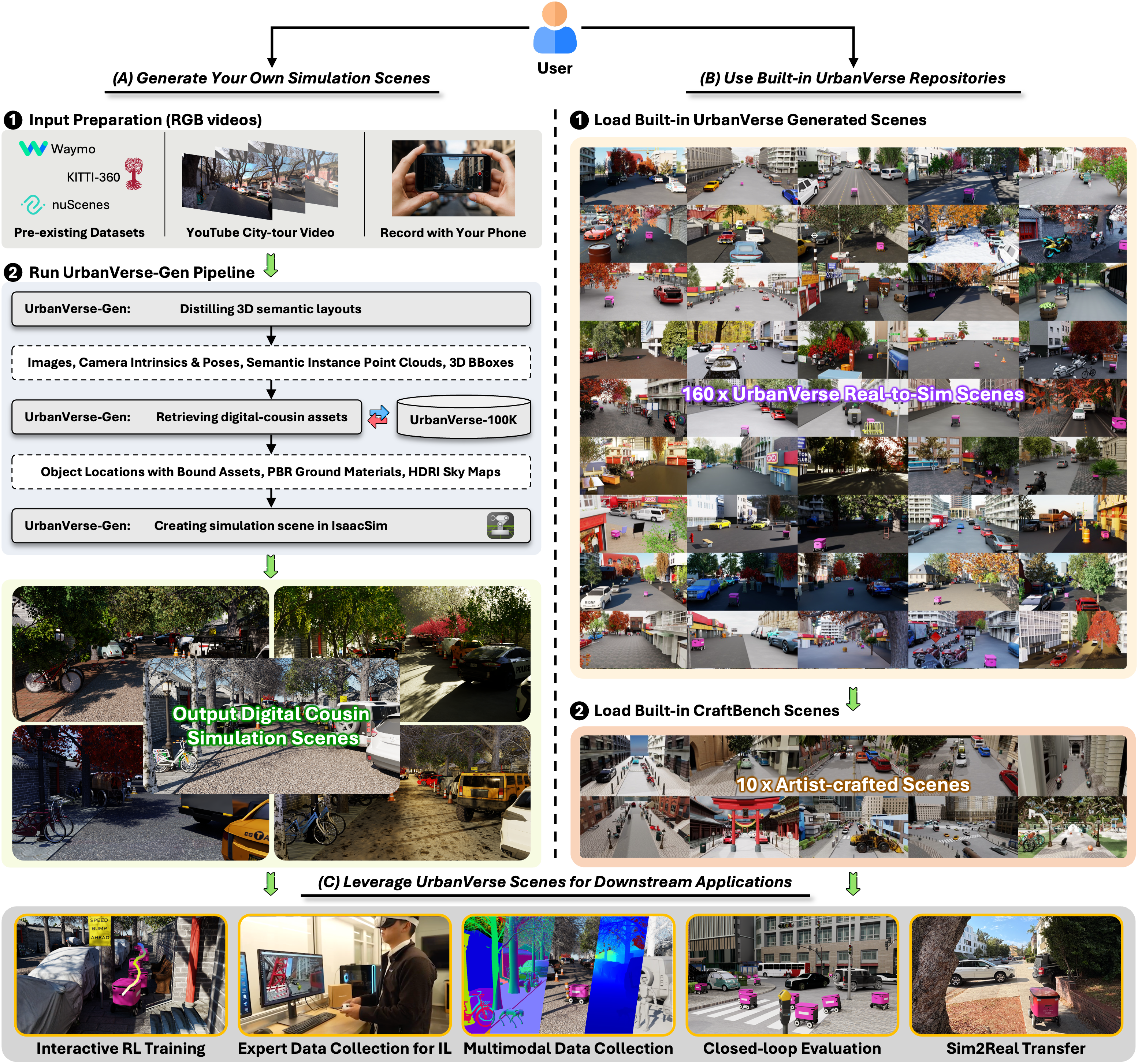 Using either custom-generated scenes or built-in scene repositories, UrbanVerse supports: